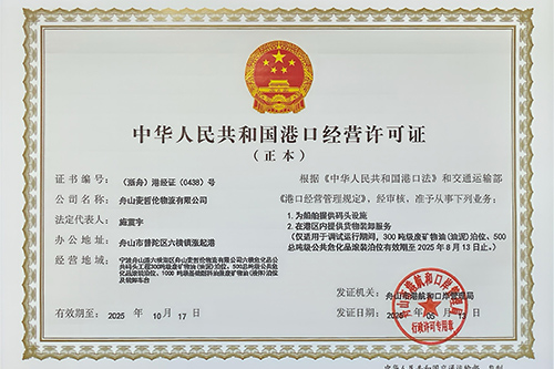 宁波舟山港六横港区舟山麦哲伦物流有限公司码头使用岸线长度为125m,设有三个泊位,设计吞吐量15 万吨/年。分别为1000吨级基础燃料油兼废矿物油(液体)泊位及装卸车台一个;500 总吨级公共危化品滚装泊位一个; 300 吨级废矿物油(油泥)泊位一个;